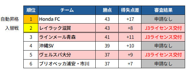 成績を考えると、ライセンスあってJ3昇格可能性があるのは滋賀、青森、V大分。HONDA、沖縄、浦安が頑張ればJ3の降格圏クラブは助かるわけね。