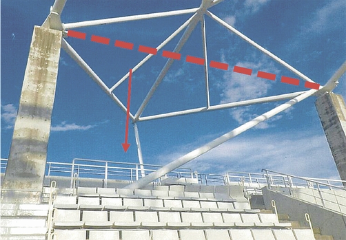 令和7年10月2日(木曜日)16時頃、バックスタンド側の照明用架台の鉄骨部材が落下し、観客席の一部が破損しているのを発見しました。人的被害はありません。