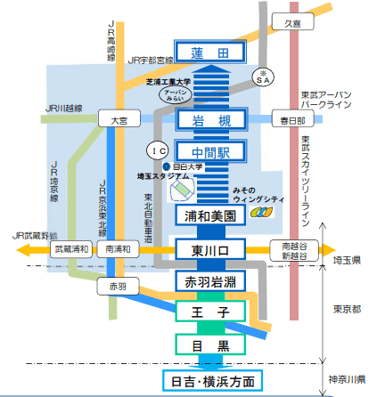 東上線志木か柳瀬川あたりから埼京線経由して、浦和、埼スタ、北越谷あたりに