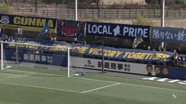 ザスパ群馬サポーターが栃木シティサポーターへ向けた横断幕メッセージを掲出 「正スタへのご来場お待ちしております」