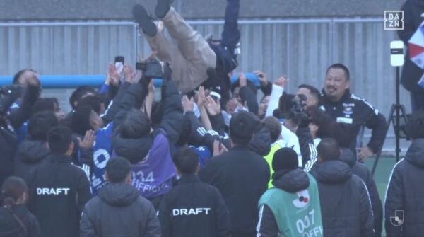 胴上げされてるのは今日で勇退する日産スタジアムのグラウンドキーパーの方です